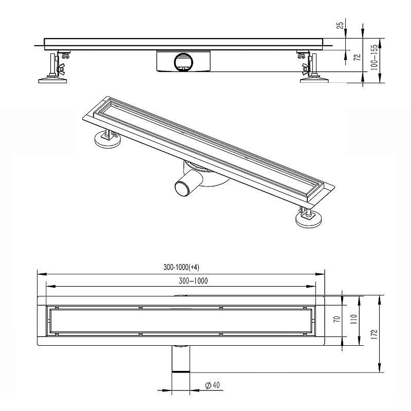 Желоб (лоток): сифон,  гидрозатвор, фильтр, регулируемые опоры  – 2 шт; гидроизоляционный материал; переходник 40/50
