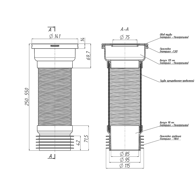 Длина трубы 250-550мм, присоединение к унитазу через резиновую муфту, выход на канализацию 100-110 мм. Для чугунных труб канализации. Удлинители гибкие выполняют функцию фановых труб и предназначены для соединения унитаза с канализационной трубой. Основное преимущество в том, что они легко монтируются и нет необходимости заранее замерять угол и расстояние (как в случае с фановыми трубами). Гофрированная часть трубы армирована металлической проволокой, что значительно повышает прочность и износостойкость изделия.
