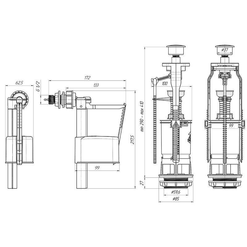 Сливной механизм белая кнопка с одним режимом слива эконом, регулировка по высоте 290-410мм.