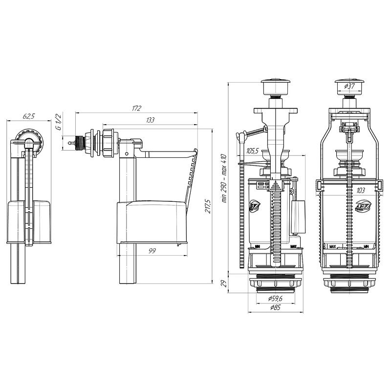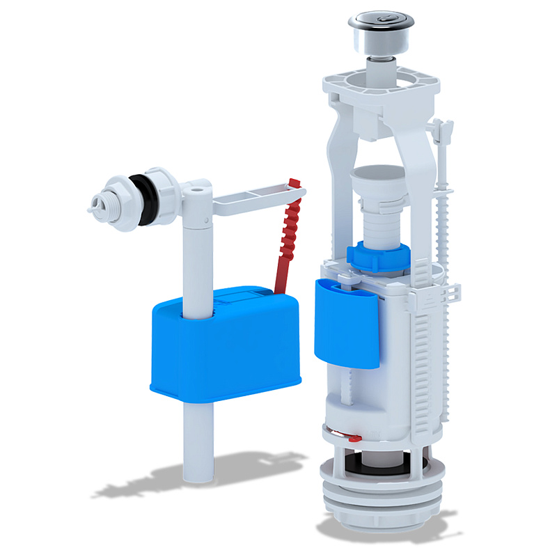 Наливной механизм с боковой подводкой и пластиковой резьбой диаметром G 1/2". Сливной механизм с двойной металлизированной кнопкой, с двойным режимом слива. Регулировка по высоте 290-410 мм. Отверстие для кнопки слива в крышке бачка 40 мм, посадочное отверстие сливной арматуры 60 мм.