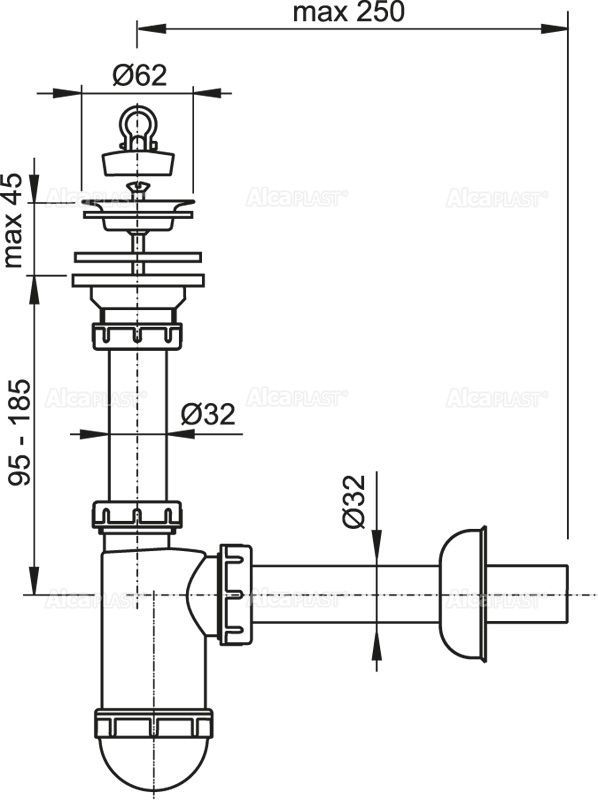 —Сифон для раковины Alcadrain 32 мм, с нержавеющей peшeткой 63 мм (A411)