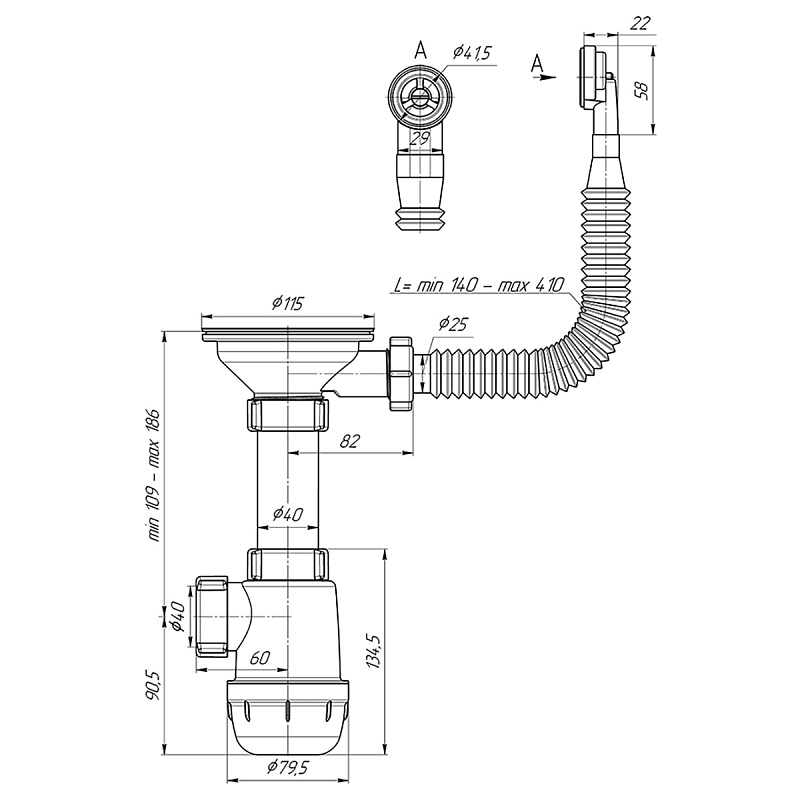 • Сифон сливной АНИ пласт A0142S для кухонных моек с диаметром сливного отверстия 90-98 мм