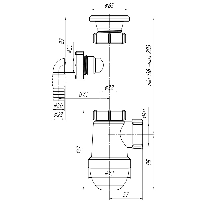 Сифон для умывания бутылочного типа с нержавеющей решеткой 65мм. С отводом для подключения бытовой техники. Выход для подключения к канализации 40мм