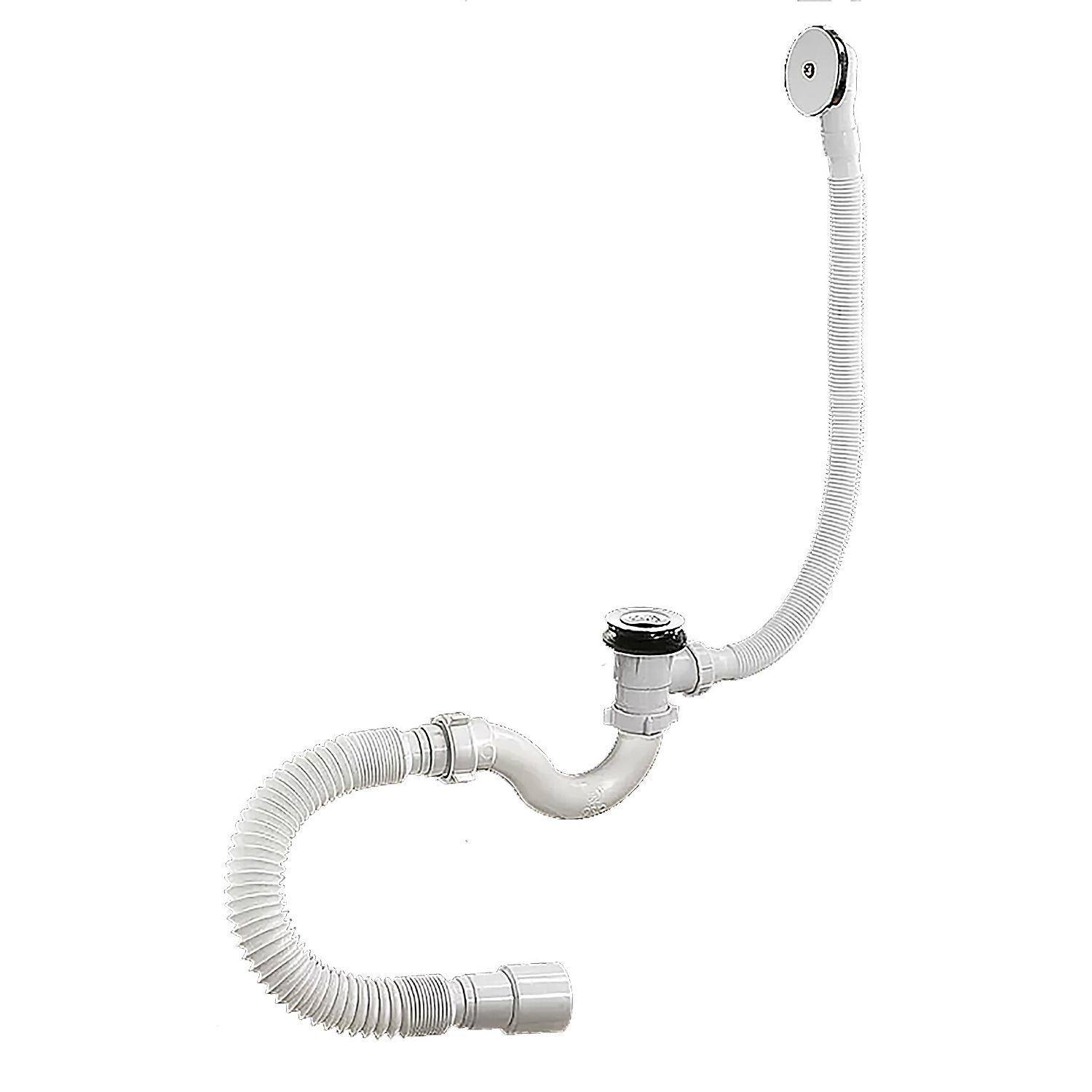 Сифон 1 1/2"х40, с переливом и автоматическим сливом с системой «клик-клак», для ванн и глубоких душевых поддонов Конструкция сифона S-образная, прямоточная, самоочищающаяся. Отвод в канализацию гибкая труба 40-40/50.
