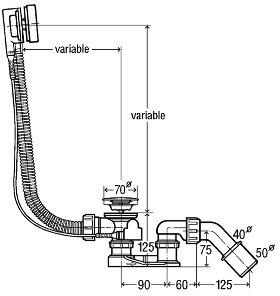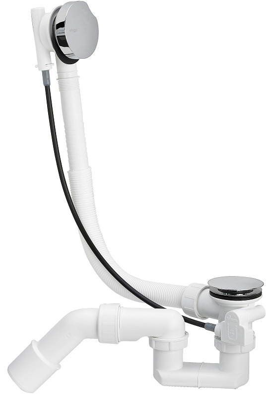 Комплектация: гибкая переливная труба, хромированная поворотная накладка переливного отверстия (верхняя), хромированная пробка донного клапана со штоком, гидрозатвор, сливное колено 45°, донный клапан - нержавеющая сталь.