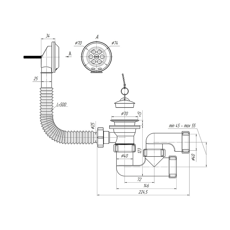 Комплектация: сифон с выпуском и переливом, упаковка.