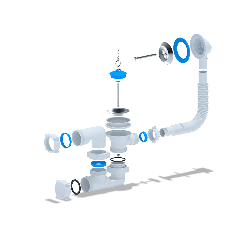 • Для ванн с отверстием слива Ø50 мм и отверстием перелива от Ø36 до 63 мм (стандартное отверстие 50 мм)