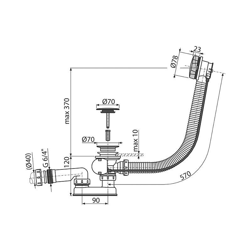 Корпус сифона с системой перелива Поворотная стальная накладка, хромированная Пробка из хромированного пластика Хромированная решетка слива из нержавеющей стали Гидрозатвор сифона из полипропилена, сваренный ультразвуковым методом, устойчив к термическим и химическим воздействиям Монтажный набор Профильное уплотнение