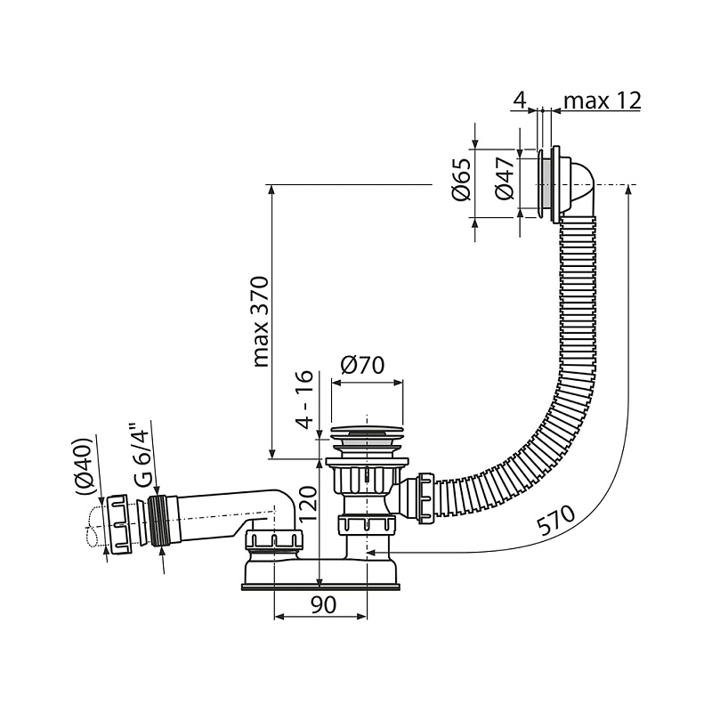 Корпус сифона с системой перелива Хромированная пластиковая решетка перелива Пробка из хромированного пластика Донный клапан из хромированного пластика Гидрозатвор сифона из полипропилена, сваренный ультразвуковым методом, устойчив к термическим и химическим воздействиям Монтажный набор Профильное уплотнение