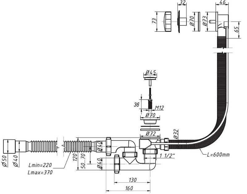 Сифон комплектуется надёжной системой полуавтомат - с нержавеющей чашкой на сливе, с грибком-крышкой (Д. 45мм), которая полностью закрывает только слив и пластиковой хромированной крышкой перелива. Длина троса и трубки перелива 60см. Регулируемая конструкция сифона позволяет максимально трансформировать его при установке и производить прочистку, не демонтируя его полностью. Гибкий отвод позволяет подключить слив сифона к канализации с диаметрами 40 или 50мм.