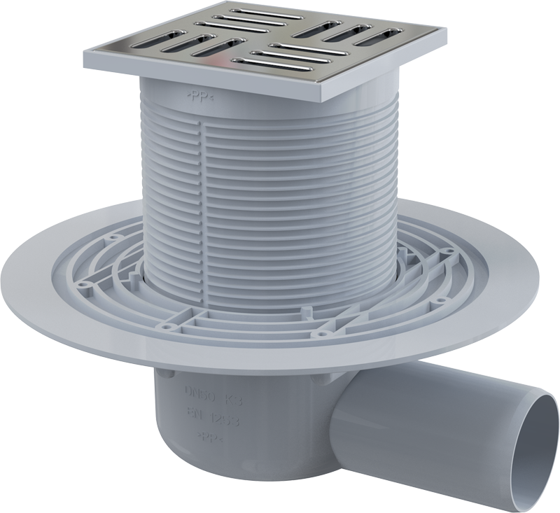 СЛИВНОЙ ТРАП 105×105/50 ММ БОКОВОЙ СТОК, РЕШЕТКА ИЗ НЕРЖАВЕЮЩЕЙ СТАЛИ, ГИДРОЗАТВОР МОКРЫЙ