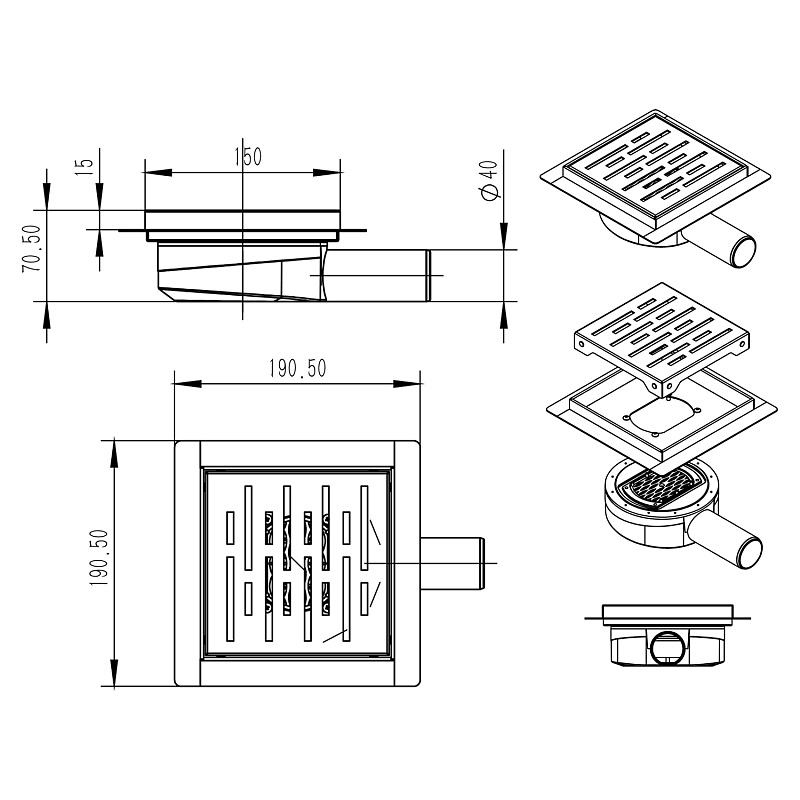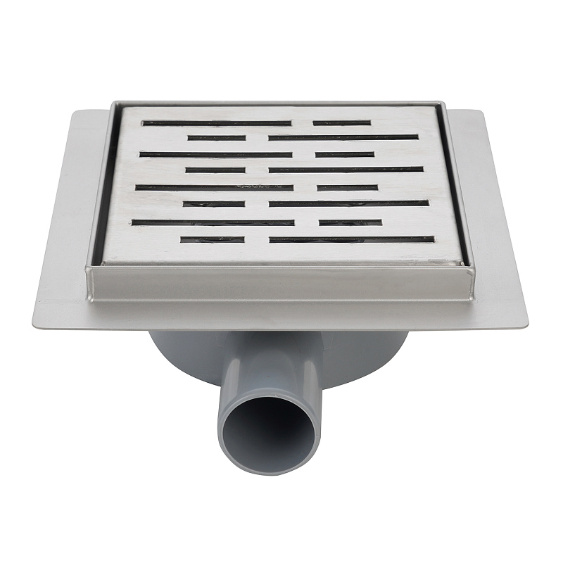 Трап для душа AZARIO 150х150 металлический, поворотный сифон 360°, перфорированная решетка, горизонтальный выпуск (AZZ3150)