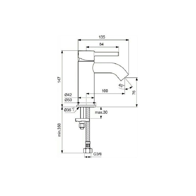 CERALINE Однорукоятковый смеситель для умывальника, картридж 35 мм с функцией HWTC (ограничение максимальной температуры горячей воды) (ВНИМАНИЕ - с марта 2021 замена на 28mm FirmaFlow), гибкая подводка G3/8", система монтажа EASY-FIX (облегченный монтаж), аэратор Cashe с ограничением потока 5 л/мин., металлическая рукоятка с индикаторами горячей / холодной воды, без донного клапана