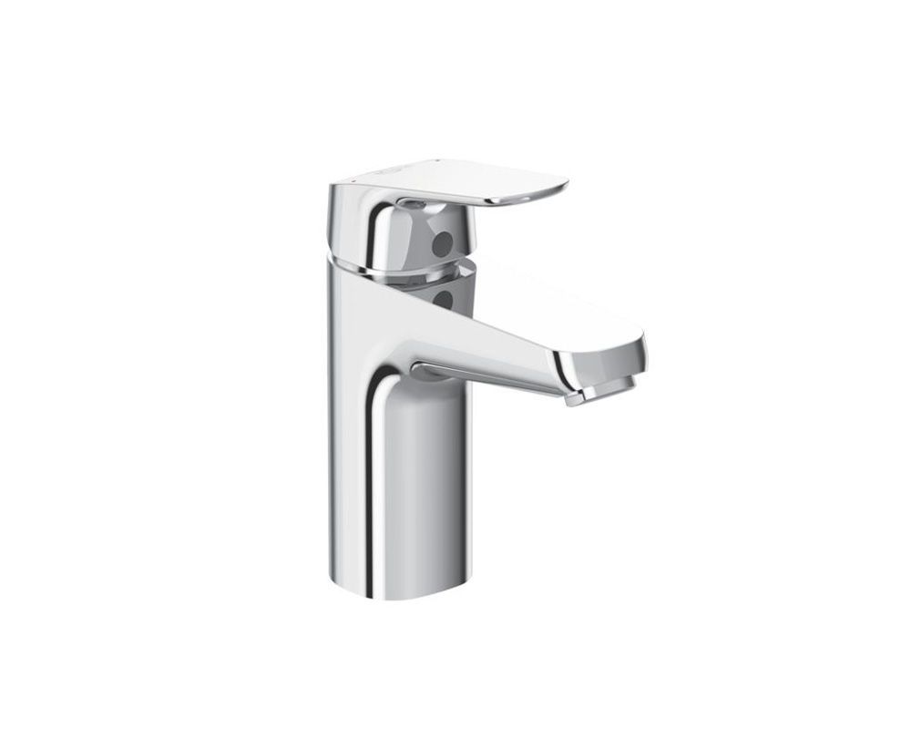 CERAFLEX Grande Однорукоятковый смеситель для умывальника, система монтажа EASY-FIX (облегченный монтаж), литой излив, длина излива 110 мм, аэратор Perlator с ограничением потока 5 л/мин., керамический картридж IS 40 мм, с функцией HWTC (ограничение максимальной температуры горячей воды), без функции CLICK, металлическая рукоятка с индикаторами горячей / холодной воды, гибкая подводка G3/8" (антибактериальные шланги PEX), шланги стандартной длины 400 мм, пластиковый донный клапан
