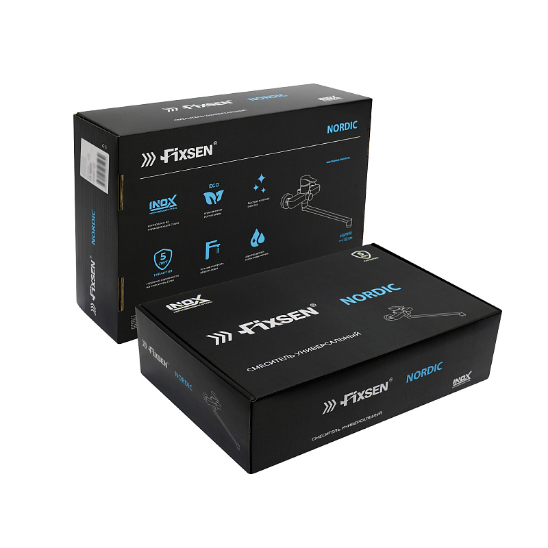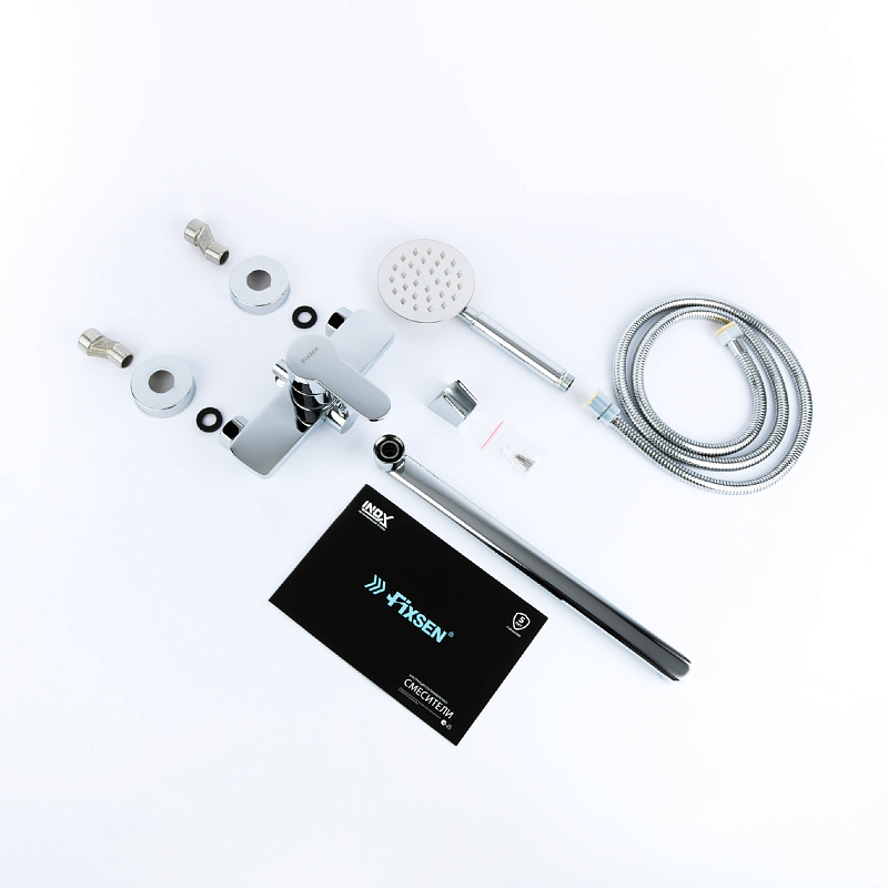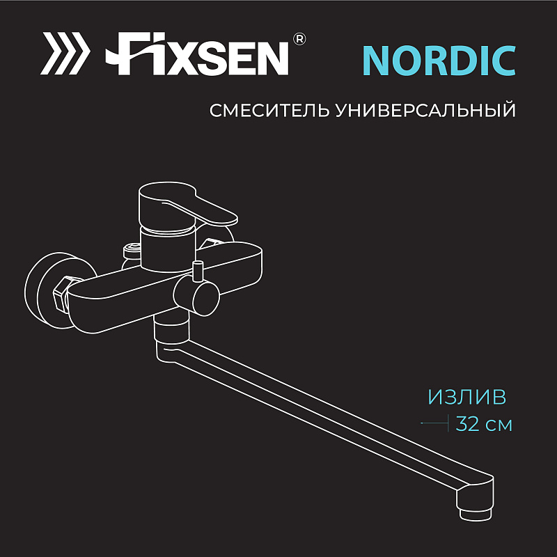 —Смеситель для ванны Fixen NORDIC однорычажный, длинный излив, керамический картридж, с душевым набором, хром (FX-8801)