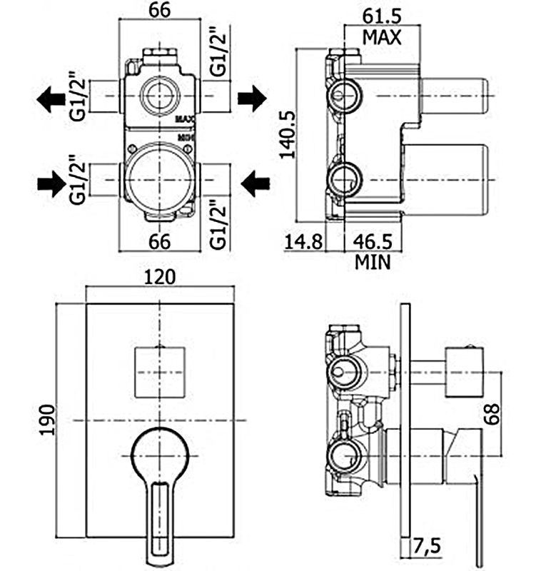 Смеситель встраиваемый для душа на 2 выхода с накладкой нерж сталь 120х190мм.девиатор-картридж, 2 положения+1 комбо, Черный матовый
