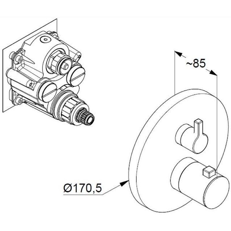 Механизм: керамический картридж с ограничителем горячей воды при 38°C и дополнительным ограничителем при 43°C.