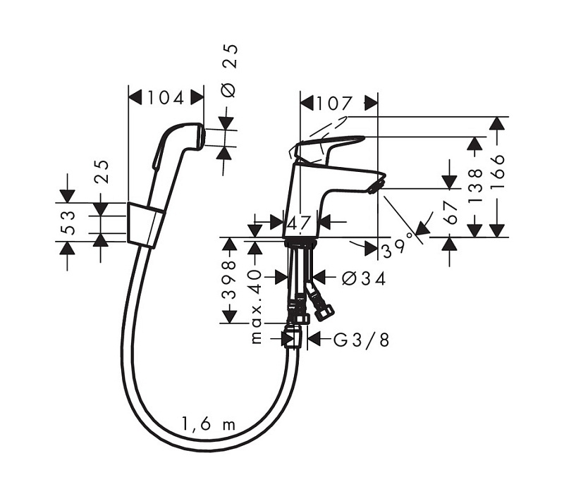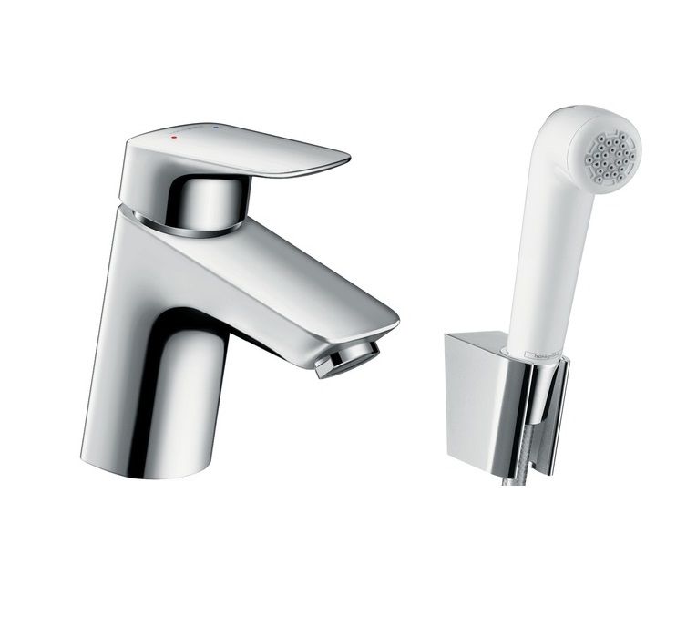 —Смеситель для раковины Hansgrohe Logis 70, без сливного гарнитура, с гигиеническим душем, однорычажный, белый/хром (71290000)
