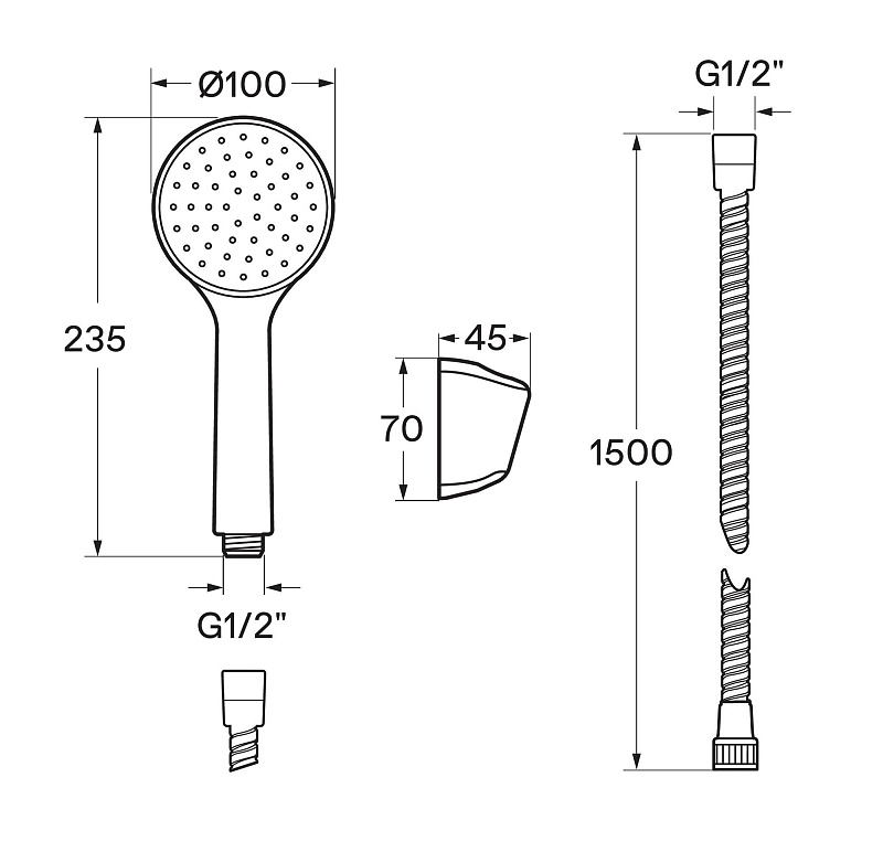 - душевой набор в комплекте: лейка ø100 мм; шланг 1.5 м, настенный держатель;