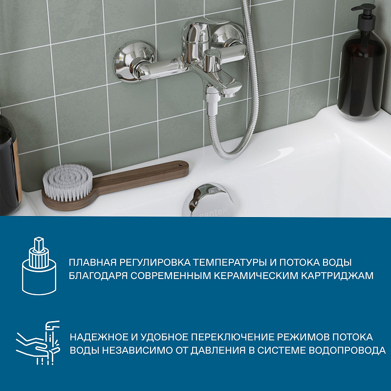 - поворортный керамический переключатель ванна/душ: надежное и удобное переключение режимов потока воды независимо от давления в системе водопровода;