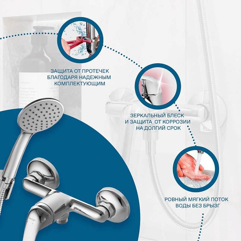- душевой набор в комплекте: лейка ø100 мм; шланг 1.5 м, настенный держатель;