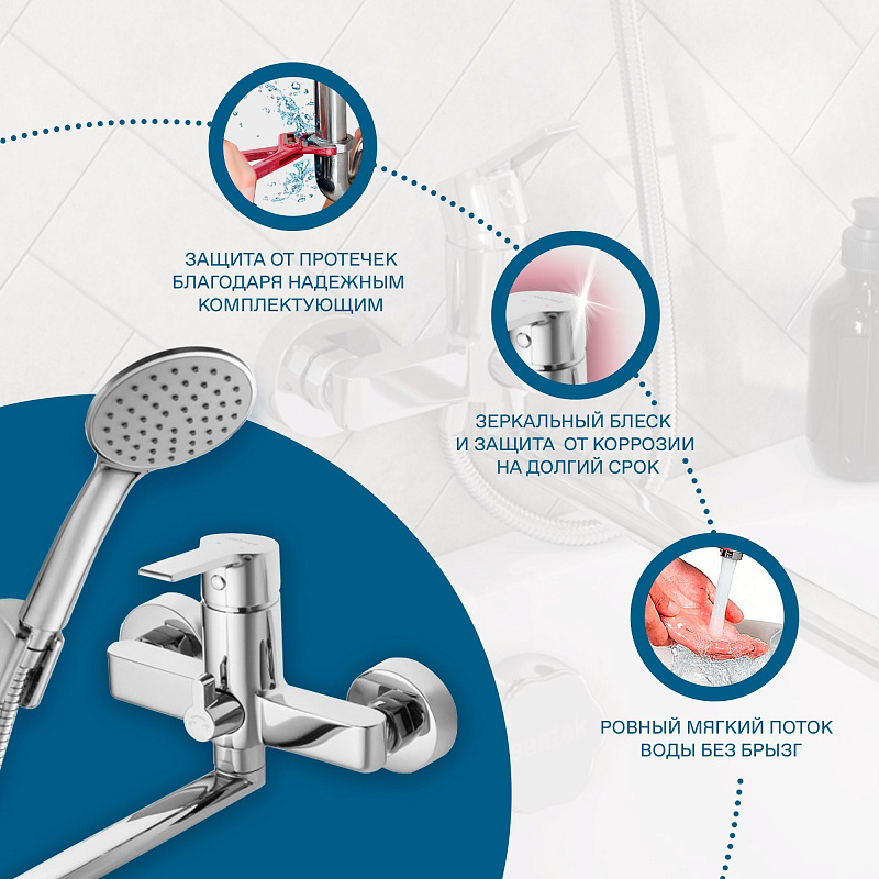 - поворортный керамический переключатель ванна/душ: надежное и удобное переключение режимов потока воды независимо от давления в системе водопровода;