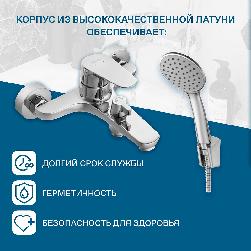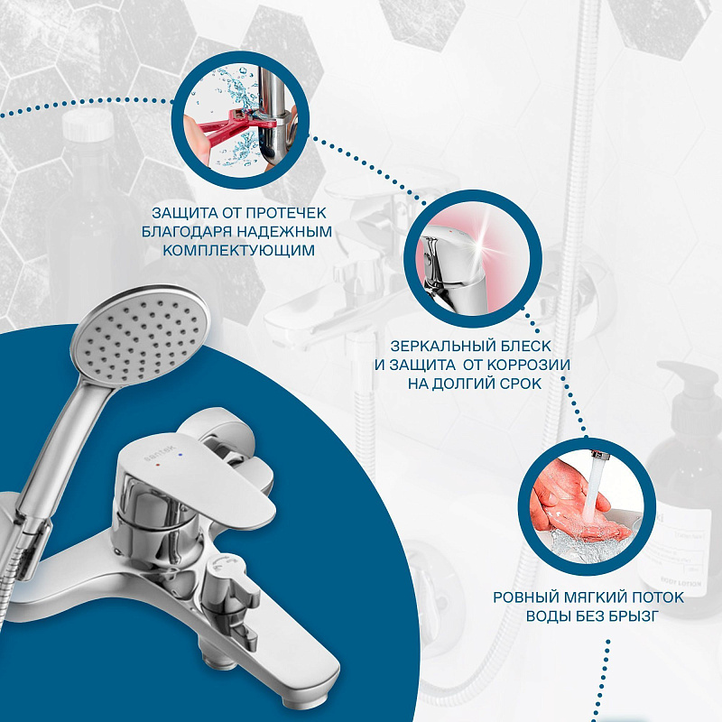 - поворортный керамический переключатель ванна/душ: надежное и удобное переключение режимов потока воды независимо от давления в системе водопровода;