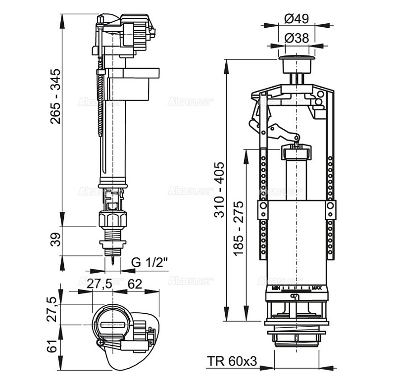 —Сливная арматура Alca Plast со стоп кнопкой, нижний подвод, хром (SA2000SK 1/2" CHROM)