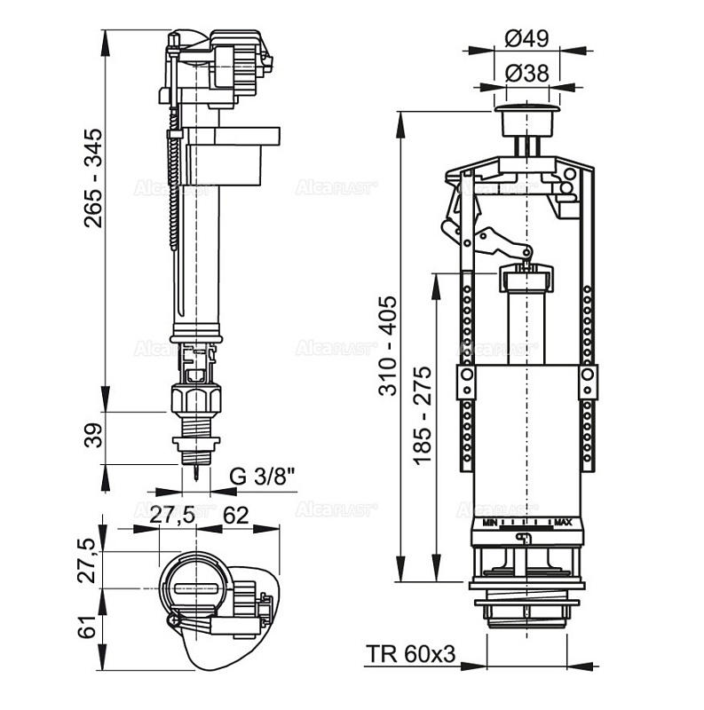 —Сливная арматура Alcaplast, со стоп кнопкой, боковой подвод, подключение 3/8'', кнопка хром (SA2000K 3/8" CHROM)