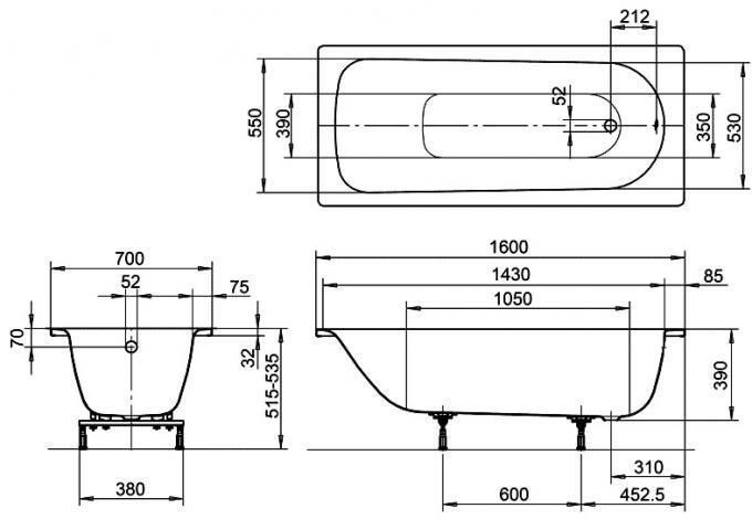 Ванна стальная Kaldewei Eurowa Verp. 160х70х39, alpine white, без ножек
