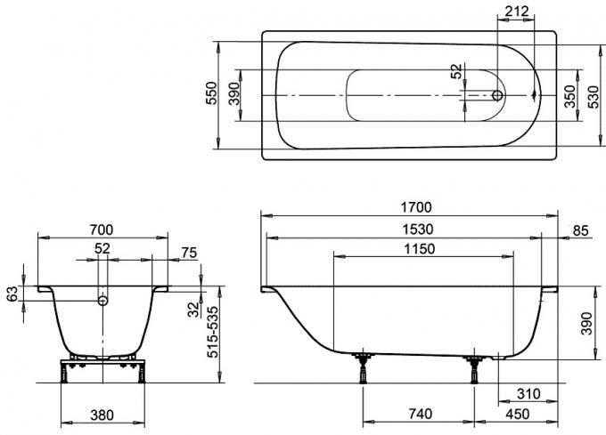 Ванна стальная Kaldewei Eurowa, Mod.312, размер 1700х700х390 мм, цвет alpine white, без ножек