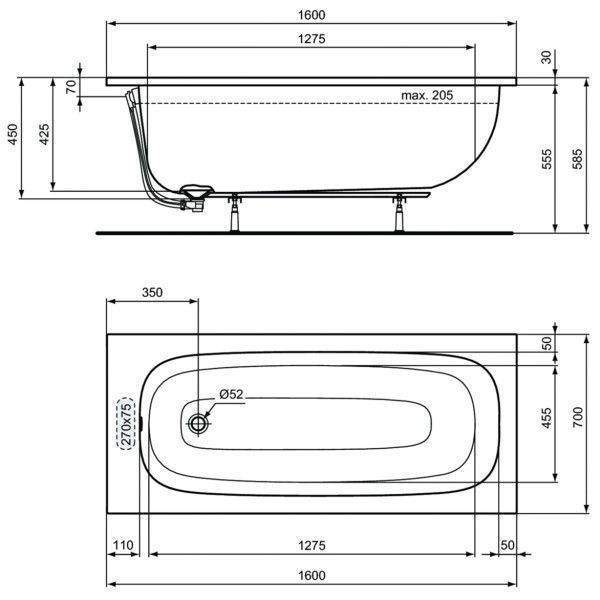 Ванна акриловая Ideal Standard i.life 1600х700 пристенная, встраиваемая (T475801)