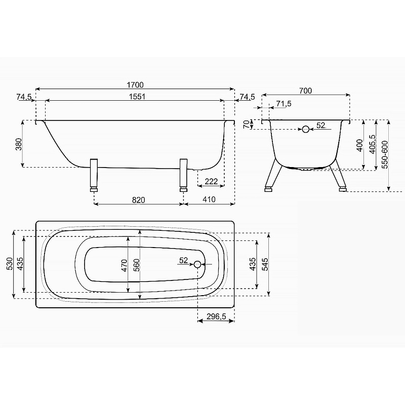 Ванна стальная ВИЗ RIANTO 170х70х40 пристенная, с опорной подставкой, с рантом (RV-170)
