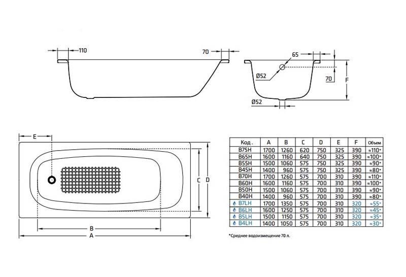 Ванна стальная BLB UNIVERSAL HG 170х70, без отверстий для ручек