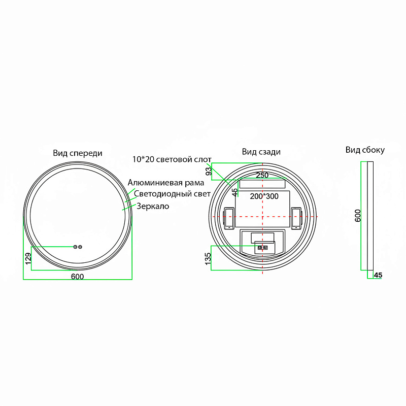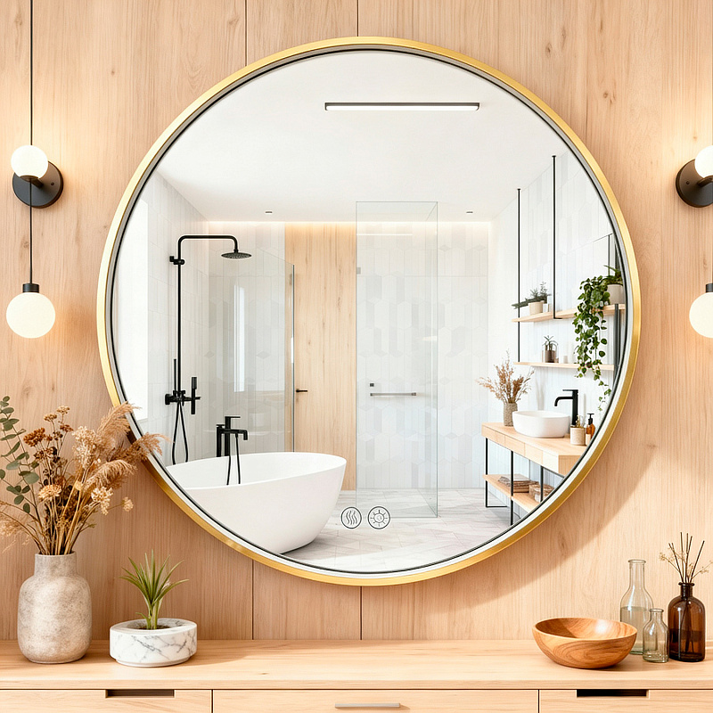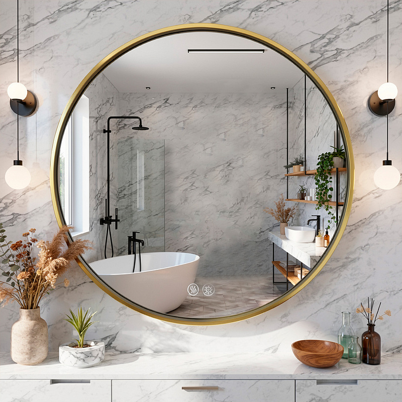 • Алюминиевый корпус золотого матового цвета: Прочный и стильный алюминиевый корпус обеспечивает долговечность и придает зеркалу элегантный, современный вид.