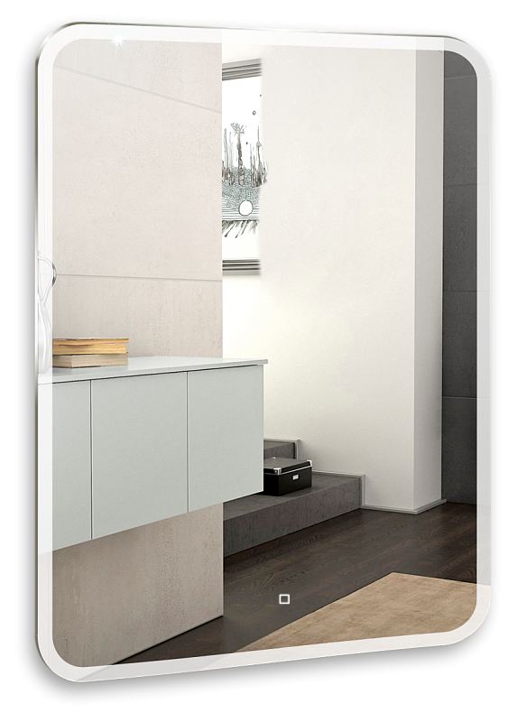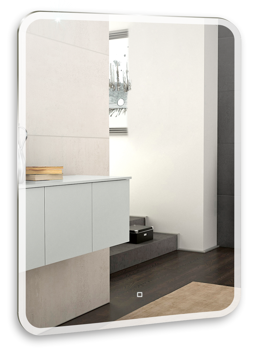 Зеркало оснащено сенсорным выключателем с функцией плавного диммирования с запоминанием последнего значения. Короткое касание светящейся области включает/выключает подсветку, длительное касание меняет яркость свечения.