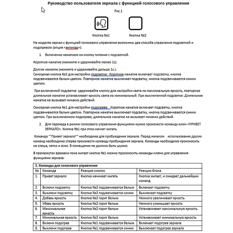 Для перехода в режим голосового управления нужно произнести команду-ключ «ПРИВЕТ, ЗЕРКАЛО». При этом кнопка голосового управления на зеркале начнет мигать. Это необходимо делать каждый раз перед использованием других команд, чтобы «пробудить» зеркало. Команды следует произносить неспеша, четко и ясно пока мигает сенсор.