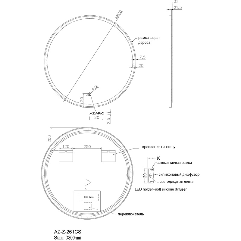 —Зеркало AZARIO Diana D800 с подсветкой, сенсорный выключатель с функцией диммера, в алюминиевой раме, цвет дерево (AZ-Z-261CS)